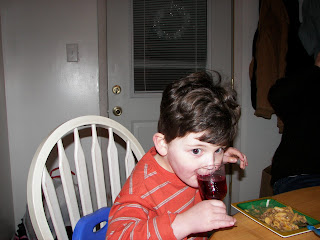 A, cooperative little ham, happily drank his grape juice and handled his "wine glass" like a champ...